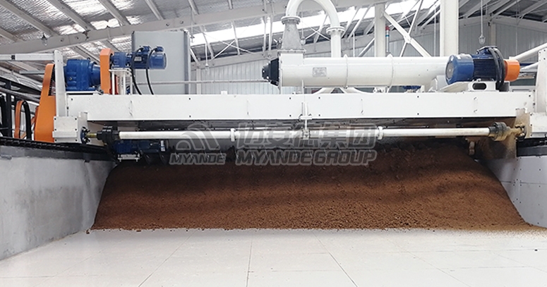 干物料經(jīng)風(fēng)送至布料機(jī)上的接種機(jī)內(nèi),物料與菌液在接種機(jī)中混合接種,布料機(jī)布料與行走同時(shí)進(jìn)行,最終將接種后的料均勻布在發(fā)酵床內(nèi),同時(shí)料層厚度可根據(jù)工藝要求來調(diào)節(jié)。